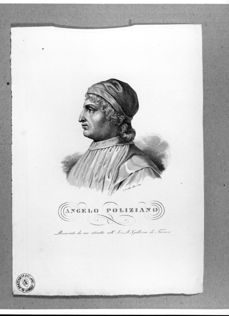 - Iscrizioni: in basso al centro:"ANGELO POLIZIANO/Ricavato da un ritratto nell'I. e R. Galleria di Firenze"; in basso a destra:"G. Scotto dis. e inc.".