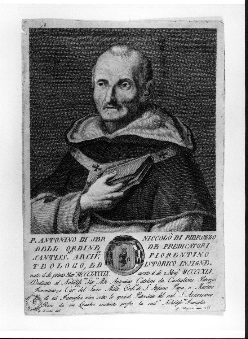 - Stemmi: in basso al centro è raffigurato, all'interno di un cerchio un cavallino. Iscrizioni: "F.ANTONINO DI SER NICCOLO' DI PIEROZZO/ DELL ORDINE DE PREDICATORI/ SANTISS. MO ARCIV.VO FIORENTINO/ TEOLOGO, ED ISTORICO INSIGNE. nato il dì primo Mar MCCCLXXXIX. morto il di' 2 Mag. MCCCCXLV./ dedicato al Nobiliss:mo ... Nobiliss. ma Famiglia; in basso a sinistra: G.Zocchi del.; in basso a destra: F. Allegrini inci 1766.