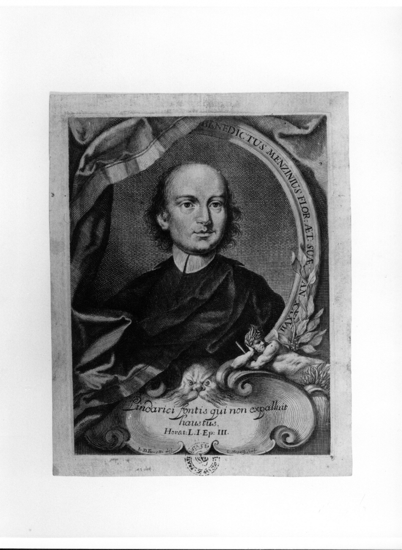 - Iscrizioni: in alto a destra:"BENEDICTUS MENZINIUS FLOR:AET: SUAE:AN XXVII"; in basso al centro:"Lindarici fontis qui non expalluit/ haustus/Horat L.I.Ep.III";in basso a sinistra:"Io D. Ferretti del"; in basso a destra:"C. Mogalli Sculp.".