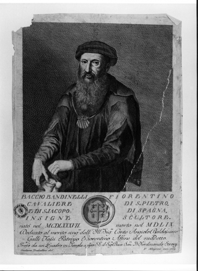 - Stemmi: in basso al centro, stemma gentilizio con all'interno raffigurati dei gigli, una croce e una palla. Iscrizioni:BACCIO BANDINELLI FIORENTINO/[...]Preso da un Quadro in Tavola appo S.E il Sig.re Duca Sen.re D. Ferdinando Strozzi; in baso a sinistra: "Giuliano Traballesi del."; in basso a destra: "F. Allegrini fc.1764".