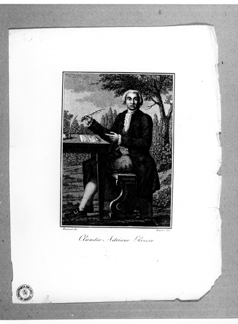 - Iscrizioni: in basso al centro:"Claudio Adriano Elvezio"; in basso a destra:" L.Rados inc";in basso a sinistra: "Bramati dis". Stampa tratta da:"Serie di vite e ritratti de' famosi personaggi degli ultimi tempi. Opera dedicata a Sua Eccellenza il Signor conte Enrico di Bellegarde".