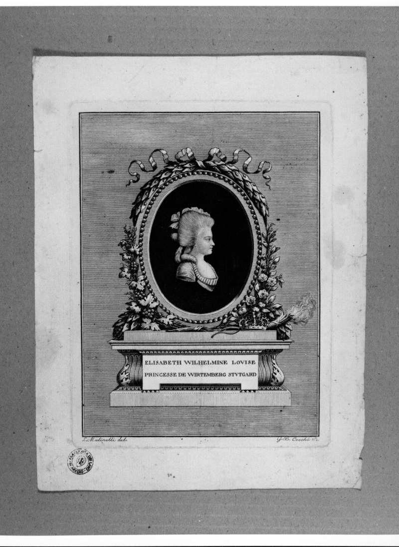 - Iscrizioni: in basso al centro:"ELISABETH WILHELMINE LOVISE/PRINCESSE DE WIRTEBERG STVTGARD";in basso a sinistra:"L. Muinelli del; in basso a destra:"G.B. Cecchi Sc."
