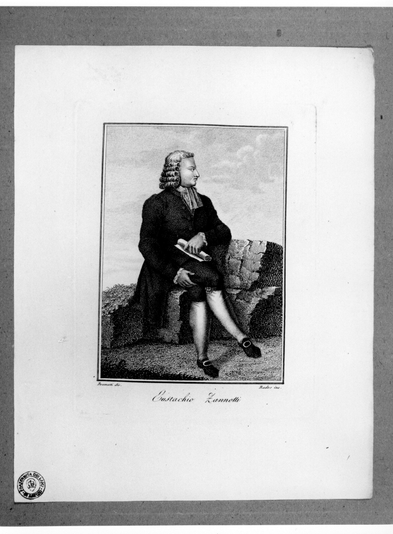 - Iscrizioni: in basso al centro:" Eustachio Zannotti"; in basso a destra:" Rados inc.";in basso a sinistra: " Bramati dis.". Stampa tratta da:"Serie di vite e ritratti de' famosi personaggi degli ultimi tempi. Opera dedicata a Sua Eccellenza il Signor conte Enrico di Bellegarde".