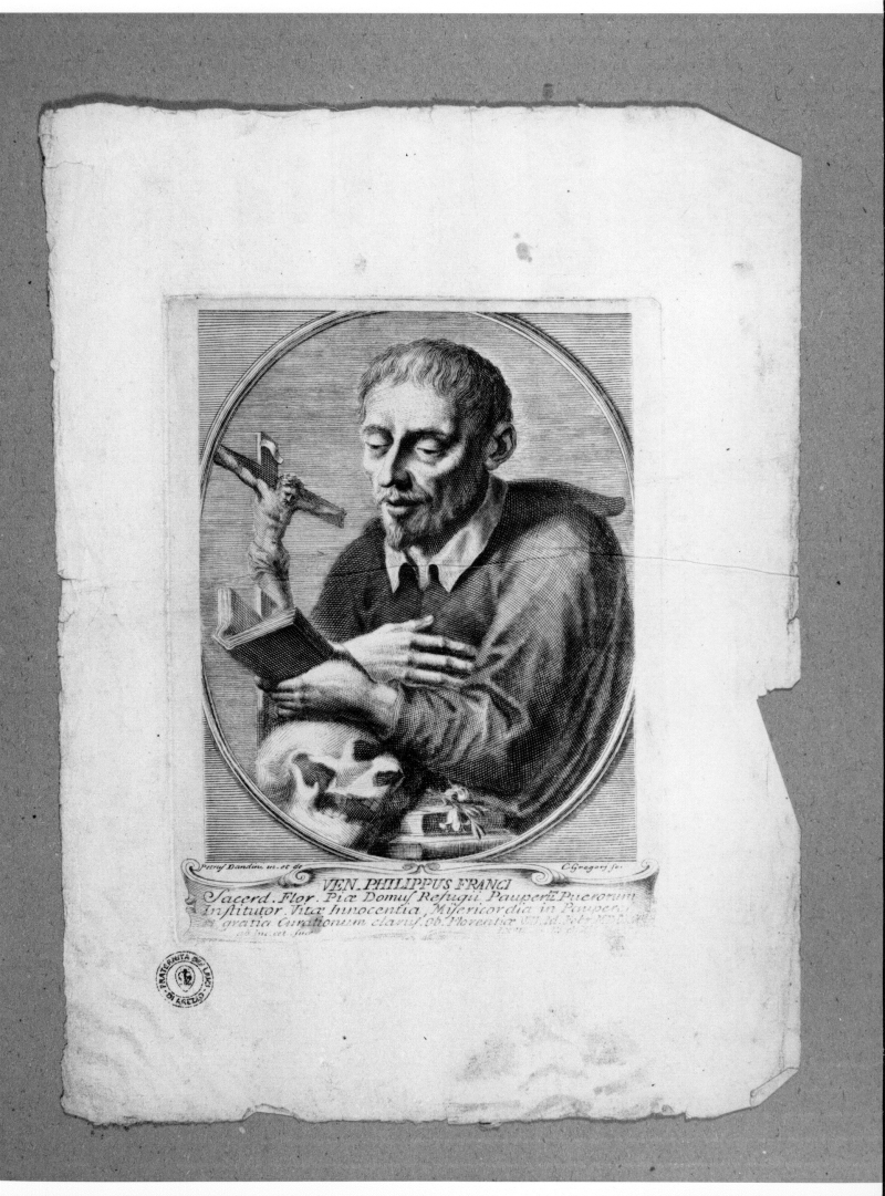 - Iscrizioni: in basso al centro, all'interno di un cartiglio:"VEN. PHILIPPUS FRANCI/Sacerd. Flor. Piae Domus. Refugii Pauperu Puerorum/ Institutor. Vita Innocentia, Misericordia in Paupere/ (...)"; in basso a sinistra:"Petrus Dandini in. et de"; in basso a destra:"C. Gregorij fe."; nel verso, in basso a destra, manoscritta a matita nera:"20/y 1/c".