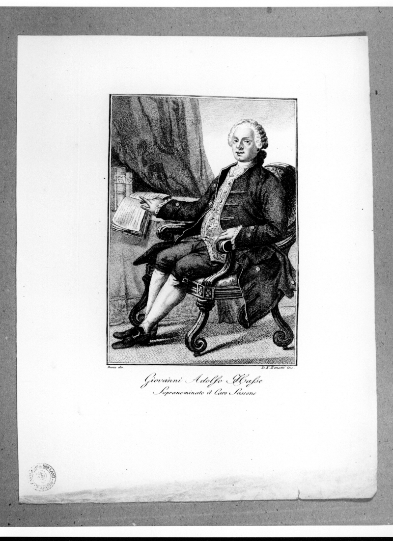 - Iscrizioni: in basso al centro:" Giovanni Adolfo Hasse. Soprannominato il Caro Sassone."; in basso a destra:"D. K. Bonatti inc."; in basso a sinistra:"Bosio dis.". Stampa tratta da:"Serie di vite e ritratti de' famosi personaggi degli ultimi tempi. Opera dedicata a Sua Eccellenza il Signor conte Enrico di Bellegarde".