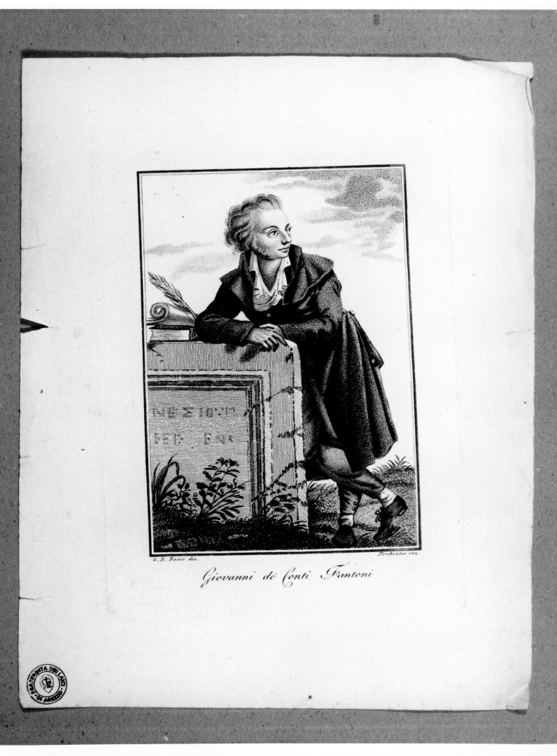 - Iscrizioni: in basso al centro:"Giovanni de' Conti Fantoni"; in basso a destra: "Torchiana inc.";in basso a sinistra: " G.B.BOSIO dis.". Stampa tratta da:"Serie di vite e ritratti de' famosi personaggi degli ultimi tempi. Opera dedicata a Sua Eccellenza il Signor conte Enrico di Bellegarde".