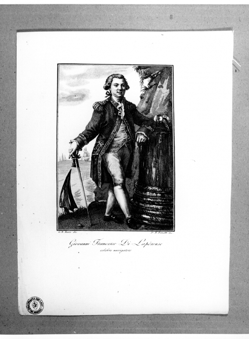 - Iscrizioni: in basso al centro:" Giovanni Francesco Di Lapèrouse/ celebre navigatore."; in basso a destra:" D.K.Bonatti inc";in basso a sinistra: "G.B.Bosio dis". Stampa tratta da:"Serie di vite e ritratti de' famosi personaggi degli ultimi tempi. Opera dedicata a Sua Eccellenza il Signor conte Enrico di Bellegarde";.