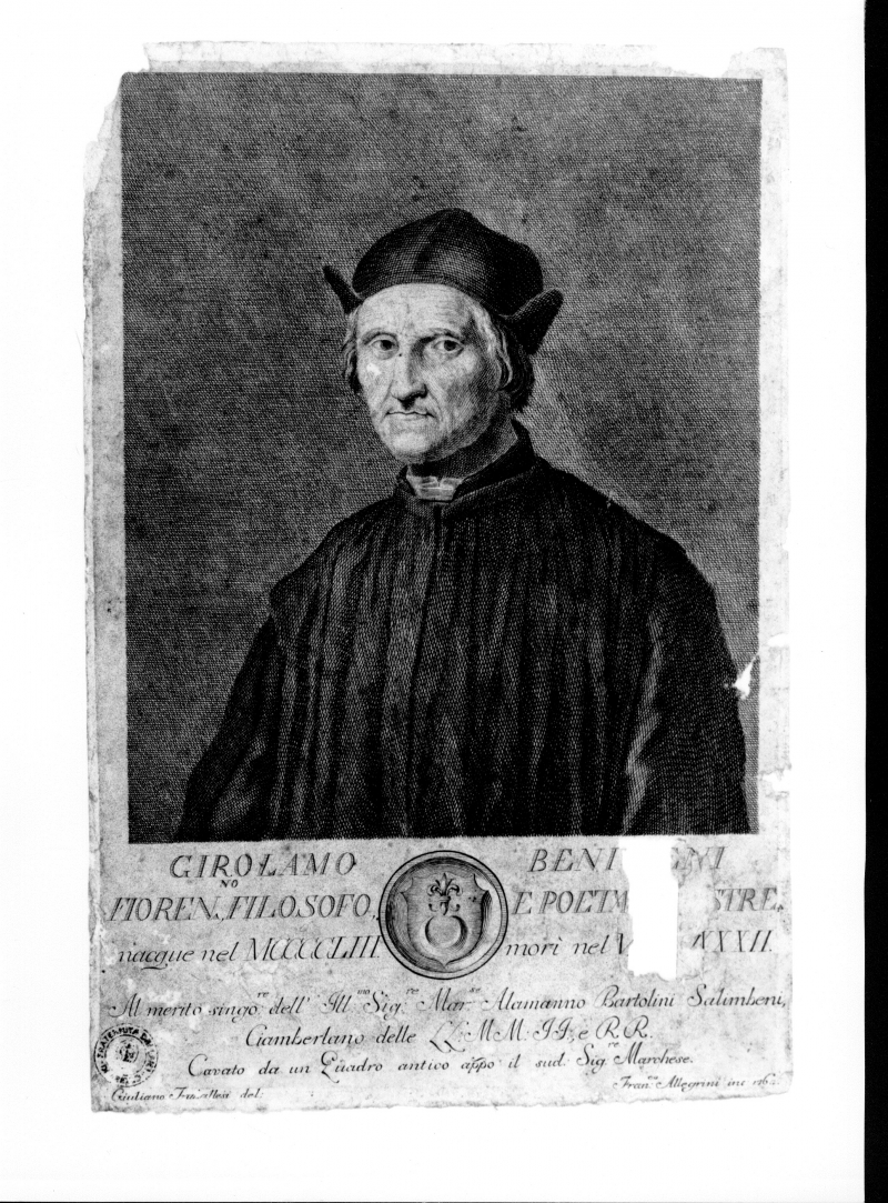 - Stemmi: in basso al centro. Iscrizioni: in basso a sinistra: "Giuliano Traballesi del."; in basso a destra: "Fran:co Allegrini inc. 1762";in basso al centro: "GIROLAMO BENIVIENI/(...)Cavato da u Quadro antico appo il sud. sig:re Marchese."
