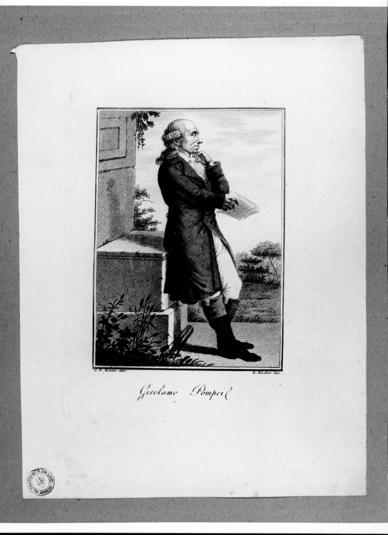 - Iscrizioni: in basso al centro:"Girolamo Pompei."; in basso a destra:"L.Rados inc."; in basso a sinistra:" G. B. Bosio dis.".