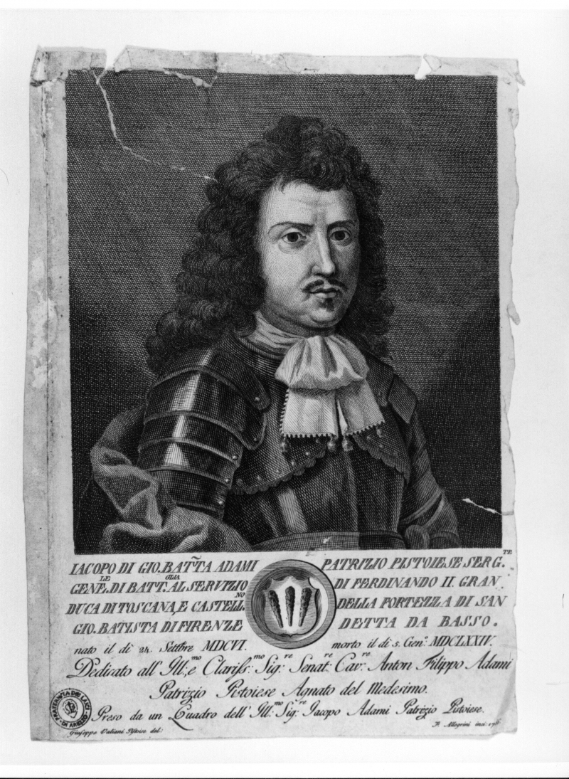 - Stemmi: in basso al centro, stemma gentilizio con all'interno tre clave. Iscrizioni: IACOPO DI GIO. BATTA ADAMI PATRIZIO PISTOIESE SERG.TE/[...]Preso da un Quadro dell'Ill.mo Sig.re Jacopo Adami Patrizio Pistoiese; in basso a sinistra: "Giuseppe Valiani Pistoiese del."; in basso a destra: "F. Allegrini inci: 1766.".