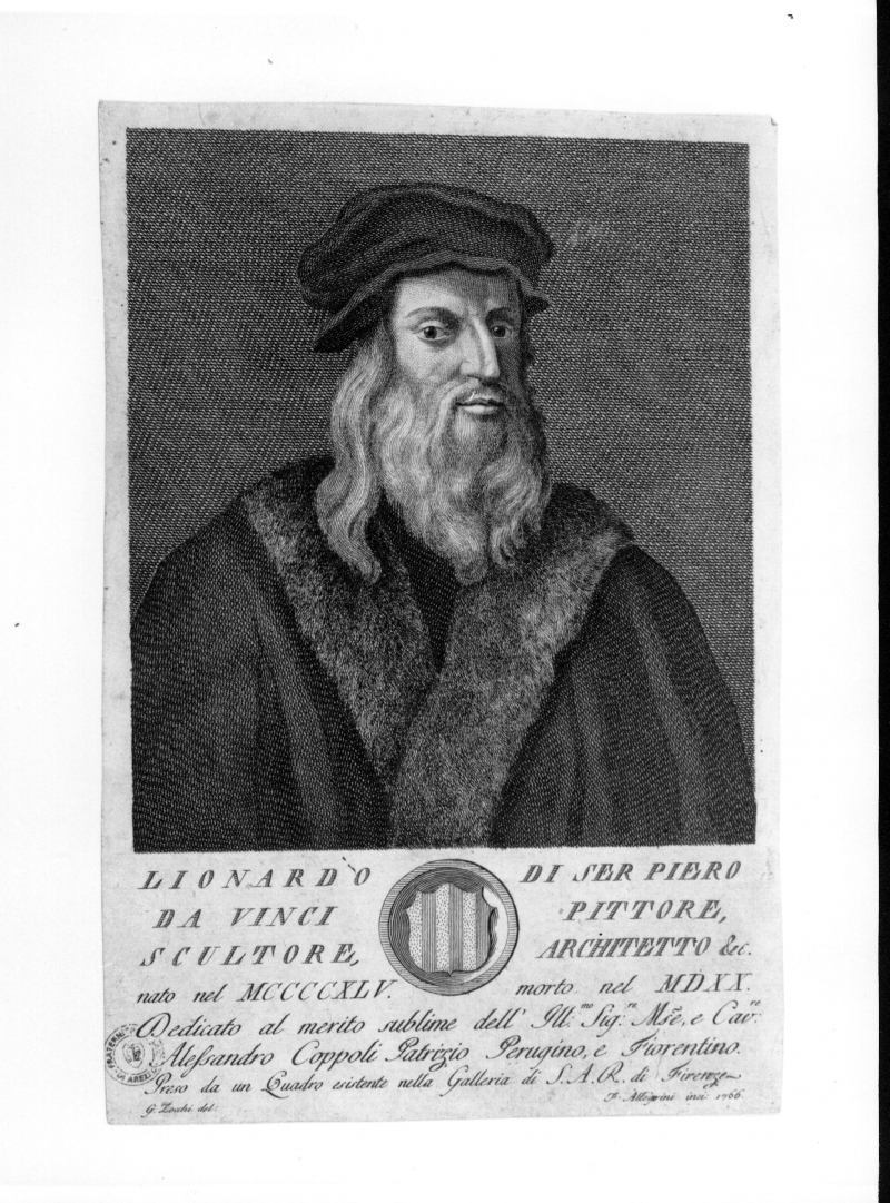 - Iscrizioni: recto:in basso al centro:"LIONARDO DI SER PIERO../Preso da un Quadro esistente nella Galleria di S.A.R di Firenze"; in basso a sinistra:"G. Zocchi del:" in basso a destra:" F. Allegrini inci: 1766". Verso: in basso a destra, manoscritta a matita nera:"68/1/Y/1/C".