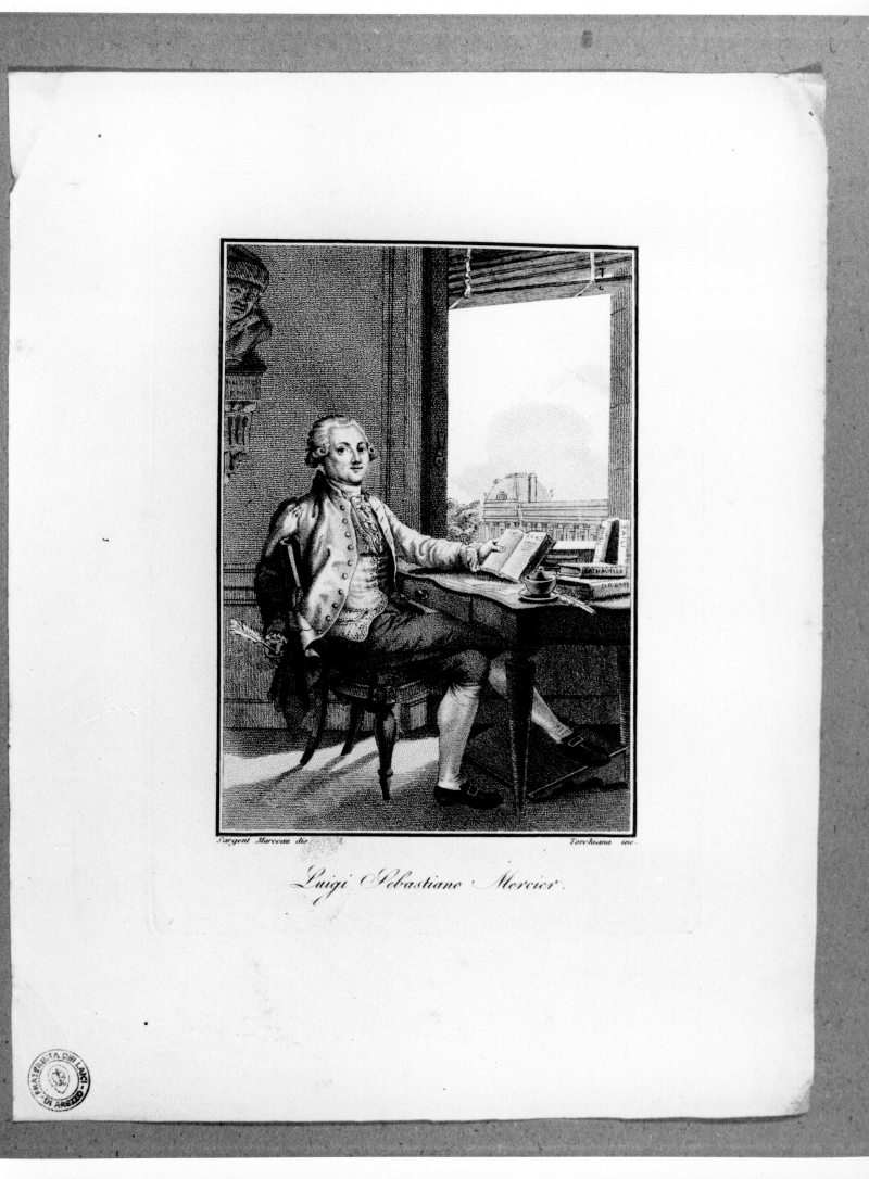 - Iscrizioni: in basso al centro:"Luigi Sebastiano Mercier.";in basso a destra:" Torchiana inc. "; in basso a sinistra: "Sargent Marceau dis.". Stampa tratta da:"Serie di vite e ritratti de' famosi personaggi degli ultimi tempi. Opera dedicata a Sua Eccellenza il Signor conte Enrico di Bellegarde".