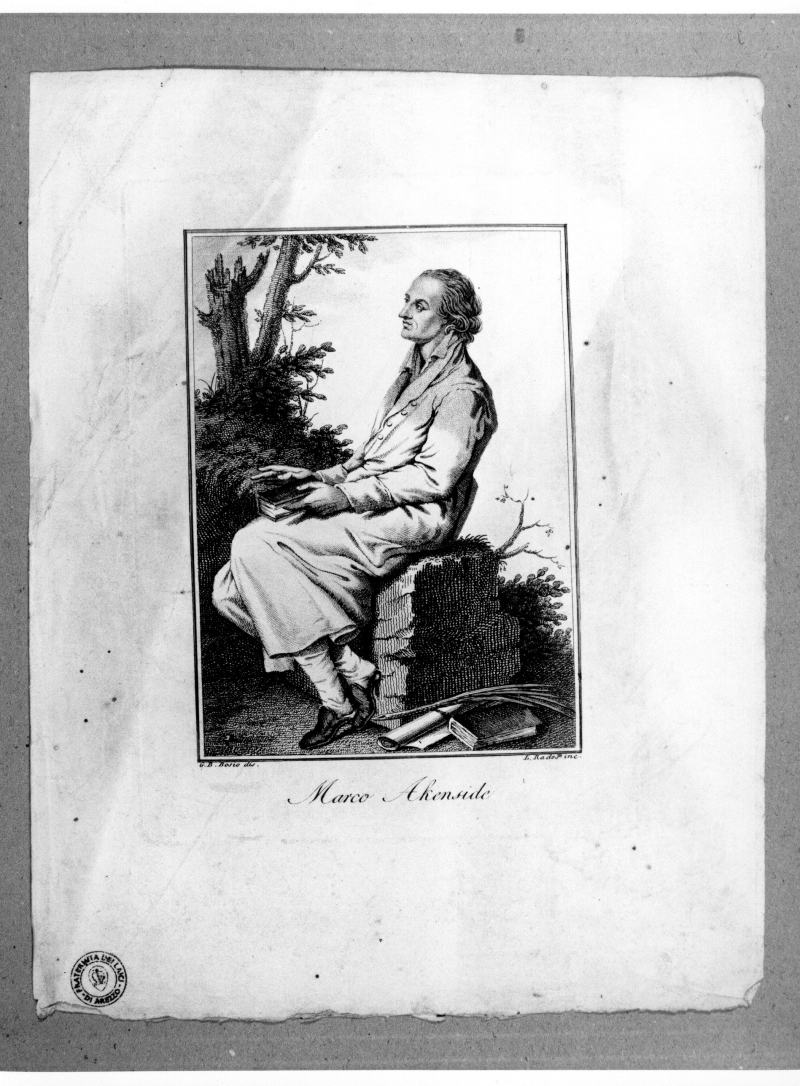 - Iscrizioni: in basso al centro:"Marco Akenside"; in basso a destra:" L.Rados inc";in basso a sinistra: "G.B.Bosio dis". Stampa tratta da:"Serie di vite e ritratti de' famosi personaggi degli ultimi tempi. Opera dedicata a Sua Eccellenza il Signor conte Enrico di Bellegarde".