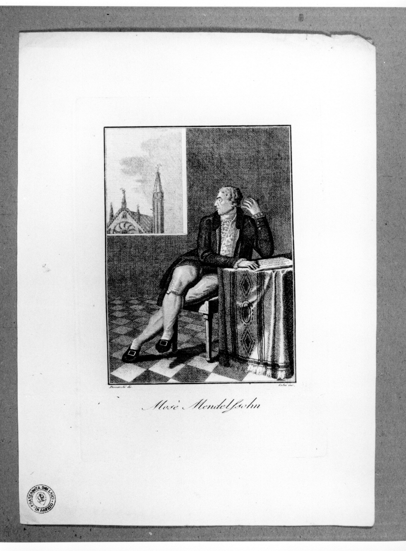 - Iscrizioni: in basso al centro:"Mosè Mendelssohn.";in basso a destra:" Colni inc."; in basso a sinistra: "Demarchi dis.". Stampa tratta da:"Serie di vite e ritratti de' famosi personaggi degli ultimi tempi. Opera dedicata a Sua Eccellenza il Signor conte Enrico di Bellegarde".