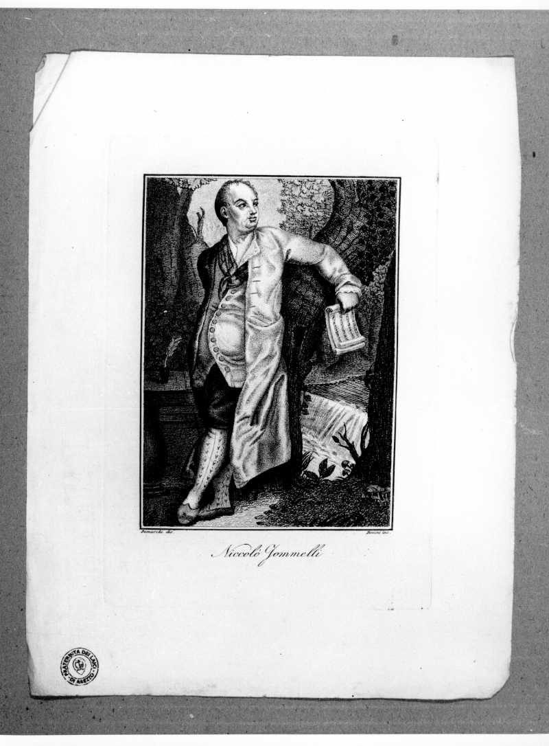 - Iscrizioni: in basso al centro:"Niccolo' Iommelli." ;in basso a destra:"Bonini inc"; in basso a sinistra:"Demarchi dis.". Stampa tratta da:"Serie di vite e ritratti de' famosi personaggi degli ultimi tempi. Opera dedicata a Sua Eccellenza il Signor conte Enrico di Bellegarde".
