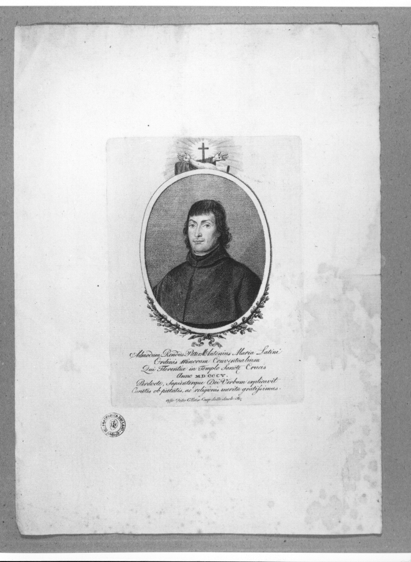 - Iscrizioni: in basso al centro:"admodum Renous Pater M. Antonius maria latini (...) camp. dalle Scuole pie."; nel verso, in alto a sinistra, manoscritta apenna e inchiostro:"N. 24"; nel verso, in basso a destra:"1/y 1/c".