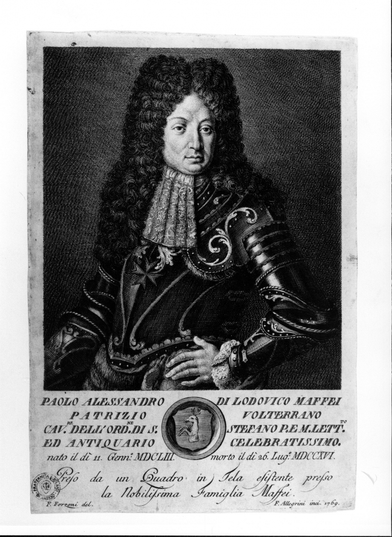 - Stemmi: in basso al centro, all'interno un cervo volto a sinistra. Iscrizioni: in basso a sinistra:"F. Forzoni del."; in basso a destra:"F. Allegrini inci. 1769"; in basso al centro: "PAOLO ALESSANDRO DI LODOVICO MAFFEI/ (...) /Preso da un Quadro in tela esistente presso/la Nobilissima Famiglia Maffei.".