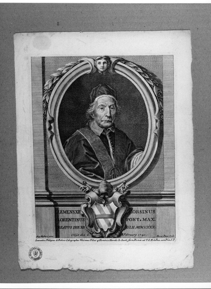 - Stemmi: in basso al centro stemma papale. Iscrizioni: in basso al centro nell'inciso:"CLEMENS XII CORSINUS / FLORENTINUS PONT. MAX. / CREATUS DIE XII. JULII MDCCXXX";in basso a sinistra:"Obyt Die 6 February 1740"; in basso a sinistra:"Aug. Massucci pinx"; in basso a destra:"Roccus Pozzi Sculp."; in basso al centro:"Laurentius Philippus de Rubeis Calcographus Vaticanus Filius q Dominici Hæredis Io. Iacobi form: Romæ ad T.S.M. de Pace cum Priv S.P.".