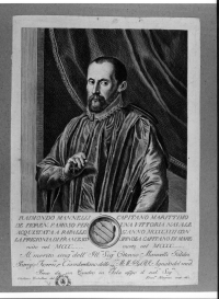 - Stemmi: in basso al centro, stemma gentilizio con all'interno tre spade. Iscrizioni: RAIMONDO MANNELLI CAPITANO MARITTIMO/[...]Preso da un Quadro in Tela appo il sud. o Sig. re; in basso a sinistra: "Giuliano Traballesi del."; in basso a destra: "Fran. co Allegrini inci.1762".