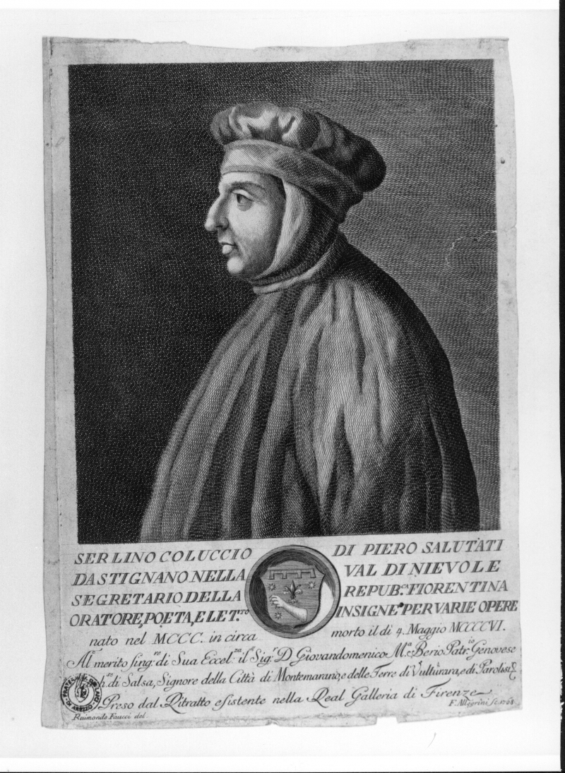 - Stemmi: in basso al centro, stemma gentilizio. Iscrizioni:SERLINO COLUCCIO DI PIETRO SALUTATI/[...]Preso dal ritratto esistente nella Real Galleria di Firenze: "Raimondo Faucci del."; in basso a destra: "F. Allegrini Sc. 1768".