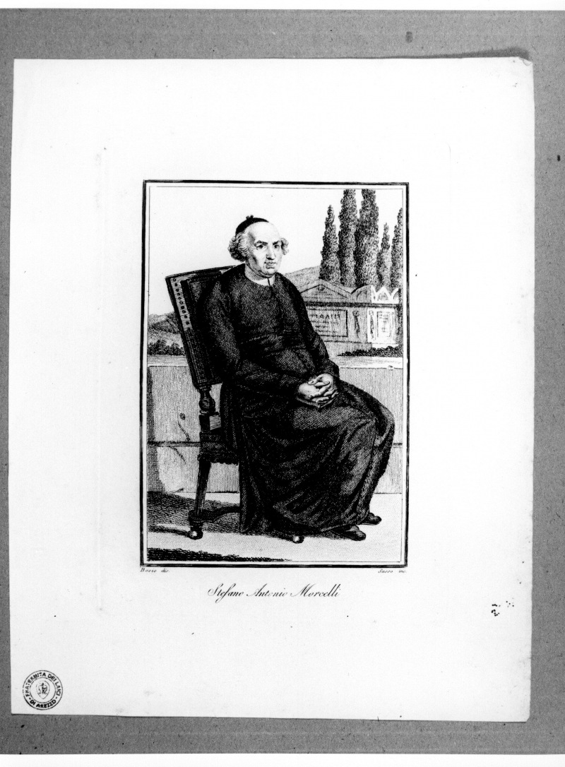 - Iscrizioni: in basso al centro:"Stefano Antonio Morcelli.";in basso a destra:"Sasso inc. "; in basso a sinistra: "Bosio dis.". Stampa tratta da:"Serie di vite e ritratti de' famosi personaggi degli ultimi tempi. Opera dedicata a Sua Eccellenza il Signor conte Enrico di Bellegarde".