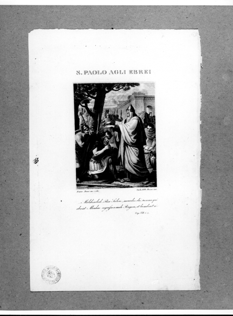 - Iscrizioni: in basso a sinistra:"Franc. Nenci inv. e dis."; in basso a destra:"Carlo della Rocca inc."; in basso al centro:"Melchisedech, Rex Salem, Sacerdos dei summe, qui/obviat Abrahae regresso a caede Regum, et benedixit ei:"; nel margine inferiore a destra:"Cap. VII v.1"; in alto al centro:"S. PAOLO AGLI EBREI"; in alto a destra, manoscritta a matita nera:"69".