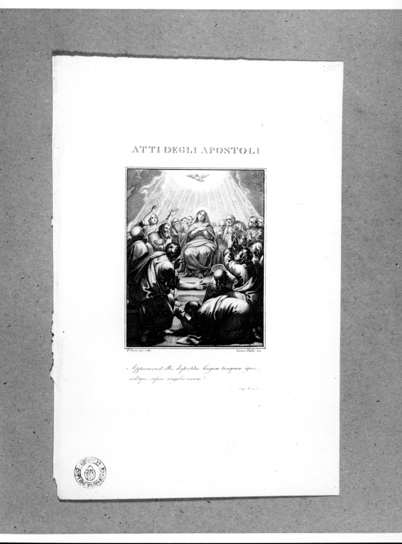 - Iscrizioni: :nel margine inferiore, a destra:"Cap: II. v.3"; in basso al centro:"Apparuerunt illis dispertitae linguae tamquam ignis,/ seditque supra singulos eorum"; in basso a sinistra:"F. Nenci inv. e dis."; in basso a destra:"Lasinio Figlio inc."; in alto al centro:"ATTI DEGLI APOSTOLI"; in alto a destra, manoscritta a matita nera:"35".
