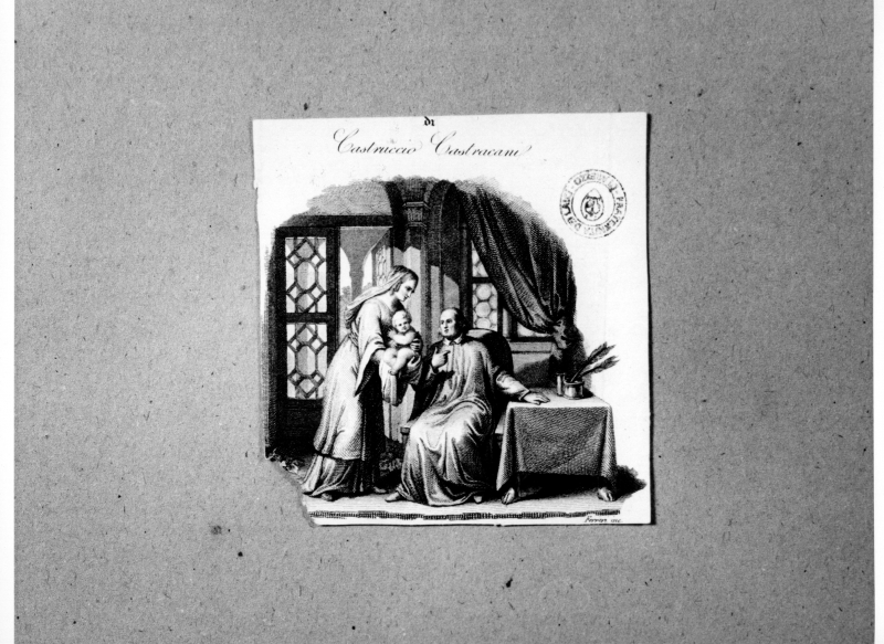 Scena di interno con donna, bambino e uomo seduto "Castruccio Castracani".