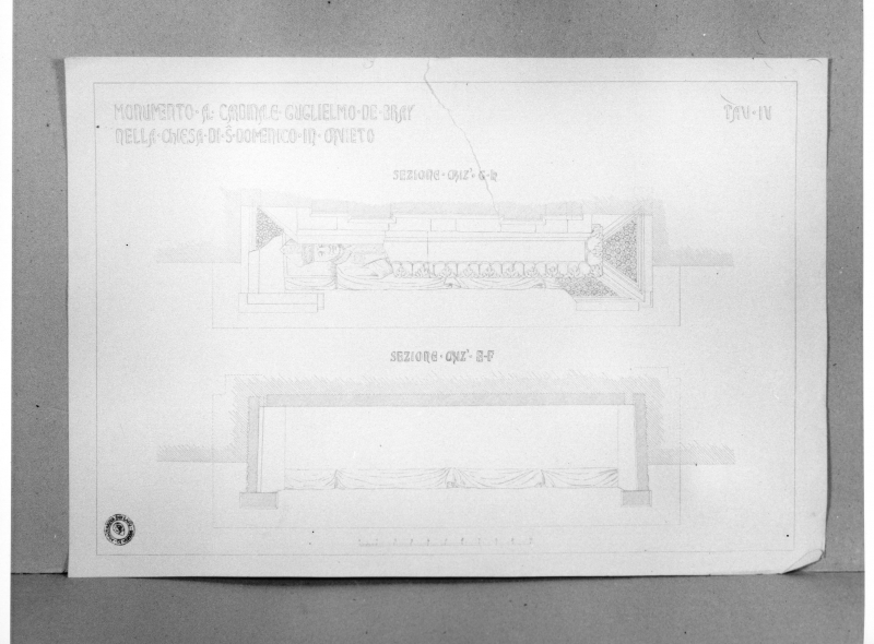 - Iscrizioni: In basso al centro:" SEZIONE ORIZ. E-F"; in alto al centro:"SEZIONE ORIZ. G-H"; in alto a sinistra: "MONUMENTO A VCARDINALE GULIELMO DE BRAY/ NELLA CHIESA DI S. DOMENICO IN ORVIETO"; in alto a destra: "TAV IV".