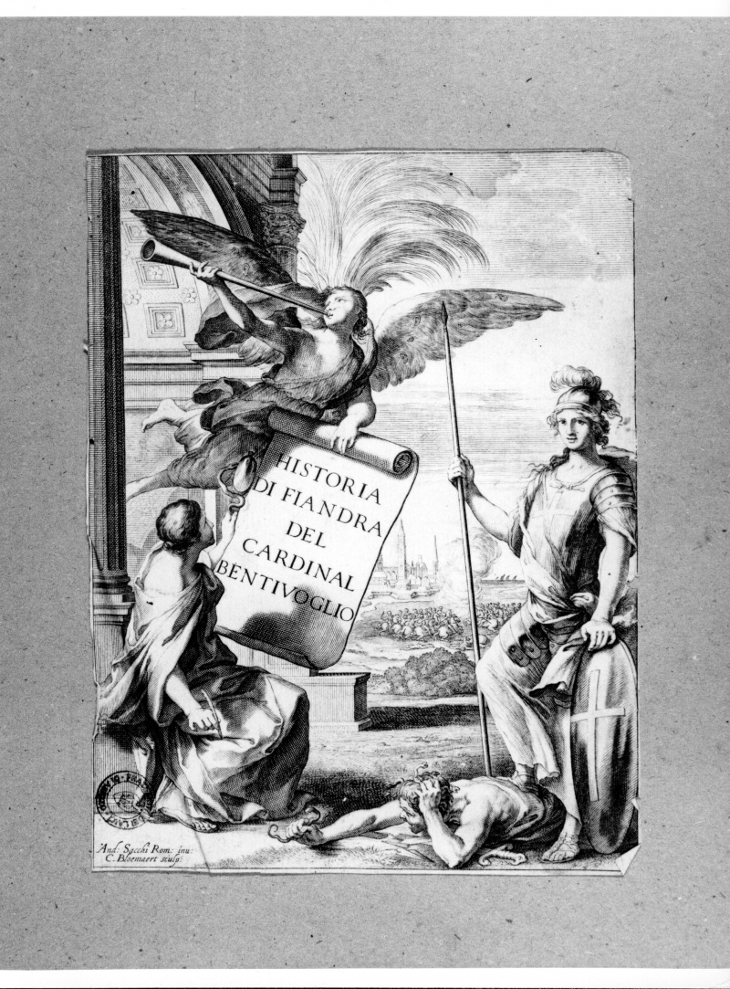 in basso a sinistra: "And: Sacchi Rom: inv:/ C. Bloemaert sculp:"; all'interno della figurazione al centro del cartiglio: "HISTORIA/ DI FIANDRA/ DEL/ CARDINAL/ BENTIVOGLIO".