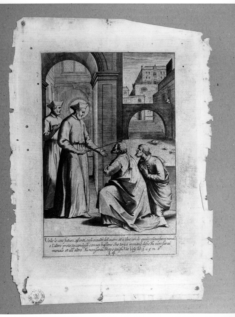 - Iscrizioni: in basso al centro:"Vede le cose future, assenti, egli occulti del cuore (...)/Vol.9.lib3.c. 5. n . 6/34"; nel verso, in basso a destra, manoscritta a matita nera:"36/y 1/c".
