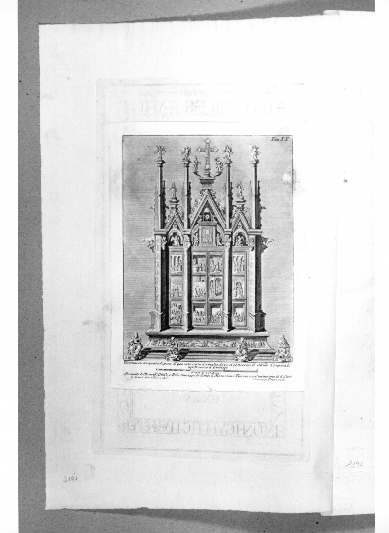 Iscrizioni: nel margine superiore a destra: "Tav. XX"; nel margine inferiore: "Tabernacolo d'argento di peso 400 istoriato a' smalto, dove si conserva il SSmo Corporale/nel Duomo d'Orvieto/Al merito di Monsig.Ilmo, e Rmo Giuseppe de' Conti d Marsciano Vescovo vigilantissimo d.a città"; in basso a sinistra: "D. Tom. Montefiori del. piccolo"; in basso a destra: "giuseppe Pozzi Scolp."