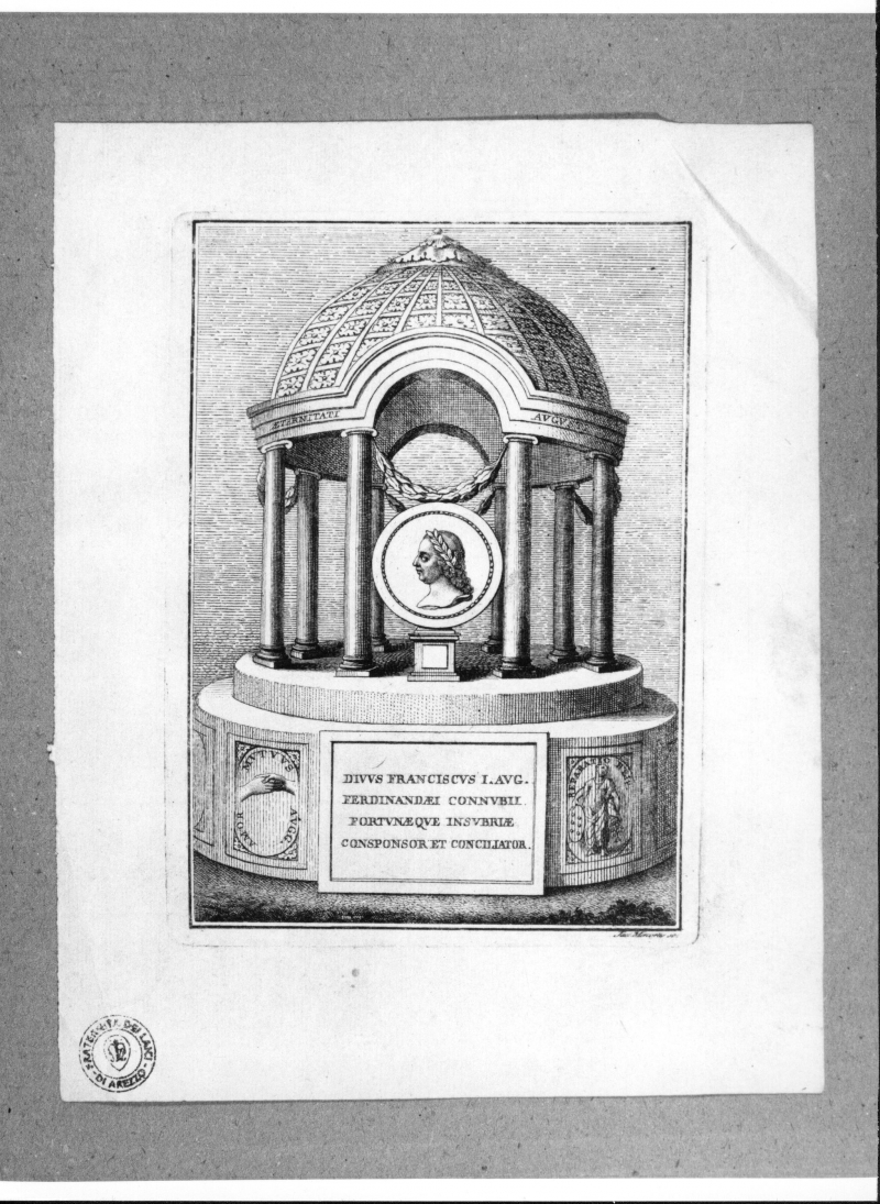 - Iscrizioni: in basso a destra: "Jac. Mercorus sc.."; all'interno della figurazione, (in alto): ETERNITATI AVGVSTI"; (in basso a sinistra): AMOR/MVTVVS/AVGG."; (in basso al centro): "DIVVUS FRANCISCVS I. AVG./FERDINANDAEI CONNVBII./FORTVNAEQVE INSVBRIAE/CONSPONSOR ET CONCILIATOR."; nel verso, in basso a destra, manoscritta a matita nera: "118/y 1/c".