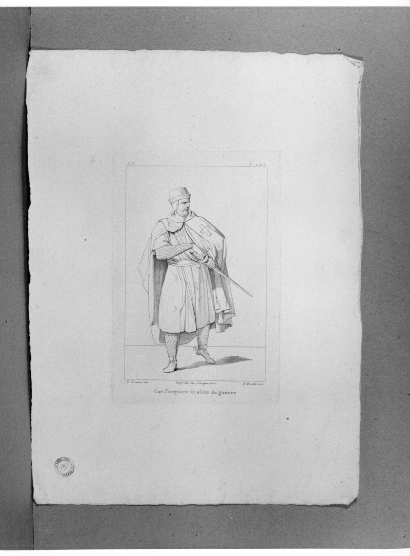 Iscrizioni: Nel margine inferiore al centro: "Cav. Templare in abito da guerra"; in basso a sinistra. "N. Consoni dis."; in basso al centro: " Prof. Cav. Gio. Silvagni dires."; in basso a destra:" N. Moneta inc."; nel margine superiore sinistro: "V.II."; nel margine superiore destro: "T. L XIV.".