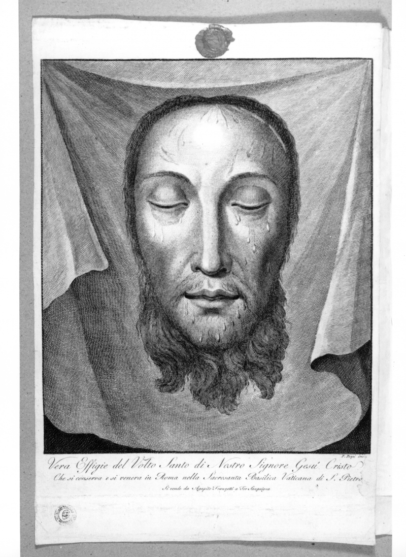 Iscrizioni: nel margine inferiore:"Vera Effigie del Volto Santo di Nostro Signore Gesù Cristo/Che si conserva e si venera in Roma nella Sacrosanta Basilica Vaticana di S.Pietro/ Si vende da Agapito Franzetti a Tor Sanguigna "; in basso a destra: "F. Pozzi inc."