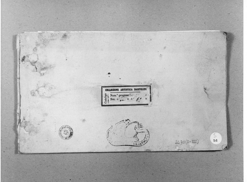 CARTELLINI: Nel piatto superiore al centro è stato incollato il cartellino stampato "COLLEZIONE ARTISTICA BARTOLINI/catalogo/Num. Progress. […] sez. N. […]”; Nel piatto superiore in basso a destra, è stato incollato un cartellino circolare stampato "5d”, al di sopra la seguente iscrizione, manoscritta a lapis: “S”.