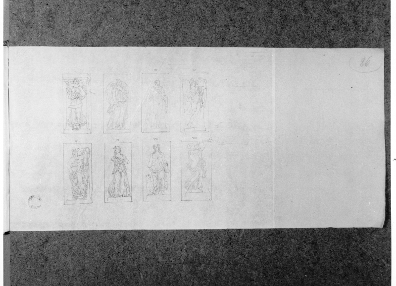 - Probabilmente si tratta di studi dai fregi del Partenone, ogni carta riporta un'iscrizione manoscritta a penna e inchiostro in basso a destra, riguardo il numero di fregio e la sua collocazione, anche la calligrafia avvalora la tesi dell'attribuzione al Bartolini.